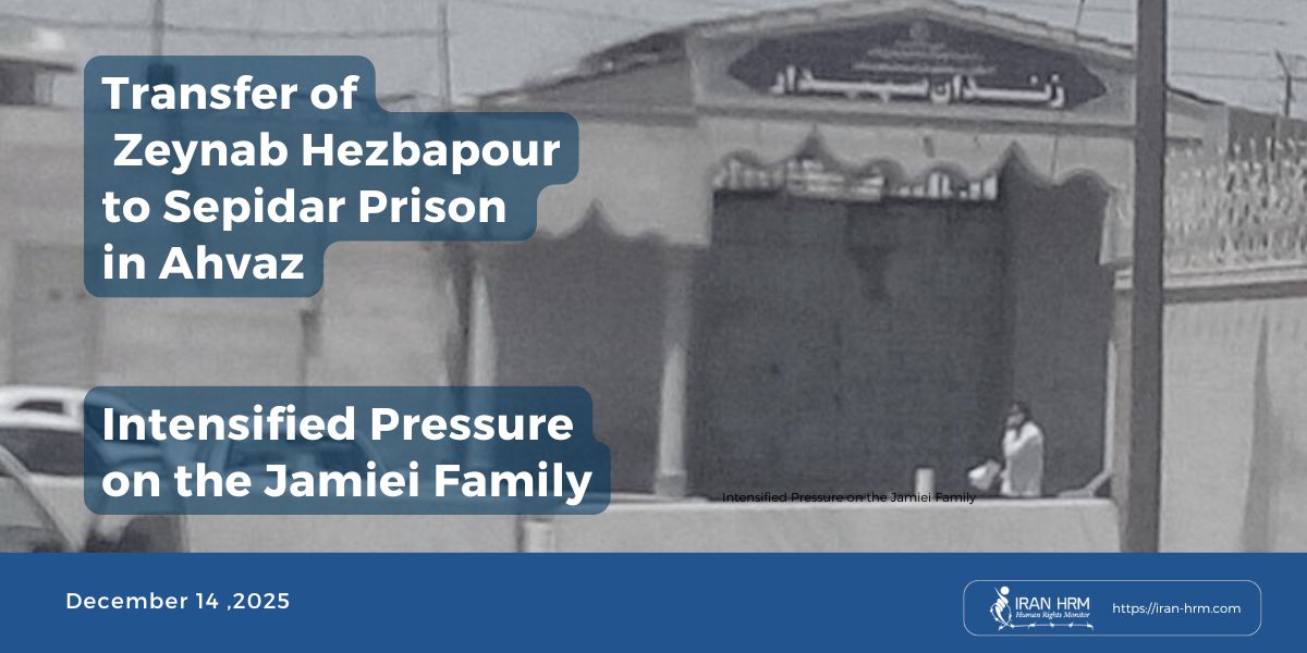 ۲۱ آذر ۱۴۰۴زینب حزباپور، همسر مسعود جامعی، زندانی سیاسی محکوم به دو بار اعدام، برای اجرای حکم ۱۵ سال حبس به بند زنان زندان سپیدار اهواز منتقل شد. این انتقال در حالی صورت گرفته که دختر او، ناهید جامعی، نیز با حکم ۱۲ سال زندان روبهروست؛ احکامی که بنا بر گزارشها در روندی فاقد معیارهای دادرسی عادلانه صادر شدهاند.