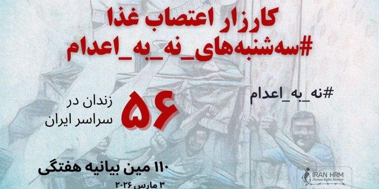 کارزار “سه‌شنبه‌های نه به اعدام” روز سه‌شنبه ۱۲ اسفند ۱۴۰۴ در صدودهمین هفته در ۵۶ زندان زیر در اعتصاب غذا می‌باشد: