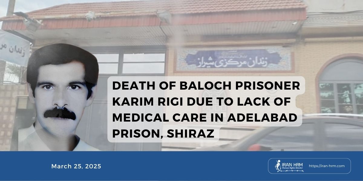 در تاریخ ۳۰ اسفندماه، یک زندانی بلوچ به نام کریم ریگی در زندان عادلآباد شیراز به دلیل ایست قلبی و عدم دریافت خدمات پزشکی بهموقع، جان خود را از دست داد. این حادثه بار دیگر وضعیت نامناسب خدمات درمانی در زندانهای ایران را برجسته کرده و نگرانیهای جدی در مورد حقوق زندانیان را مطرح میکند.