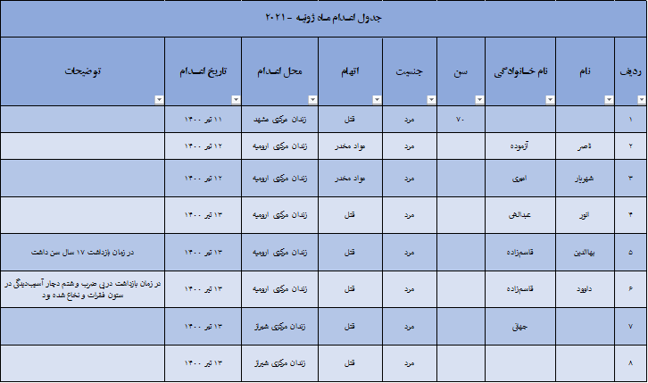 پس از روی کار آمدن ابراهیم رئیسی در اواخر خرداد ماه و همزمان با انتصاب غلامحسین اژهای بعنوان رئیس قوه قضائیه، میزان اجرای احکام اعدام بصورت قابل توجهی افزوده شده است. از ابتدای سال جاری میلادی بیش از ۱۸۰ اعدام در زندانهای مختلف ایران صورت گرفته است که بیش از ۳۸ اعدام در فاصله یک ماه اخیر اجرا شده است.