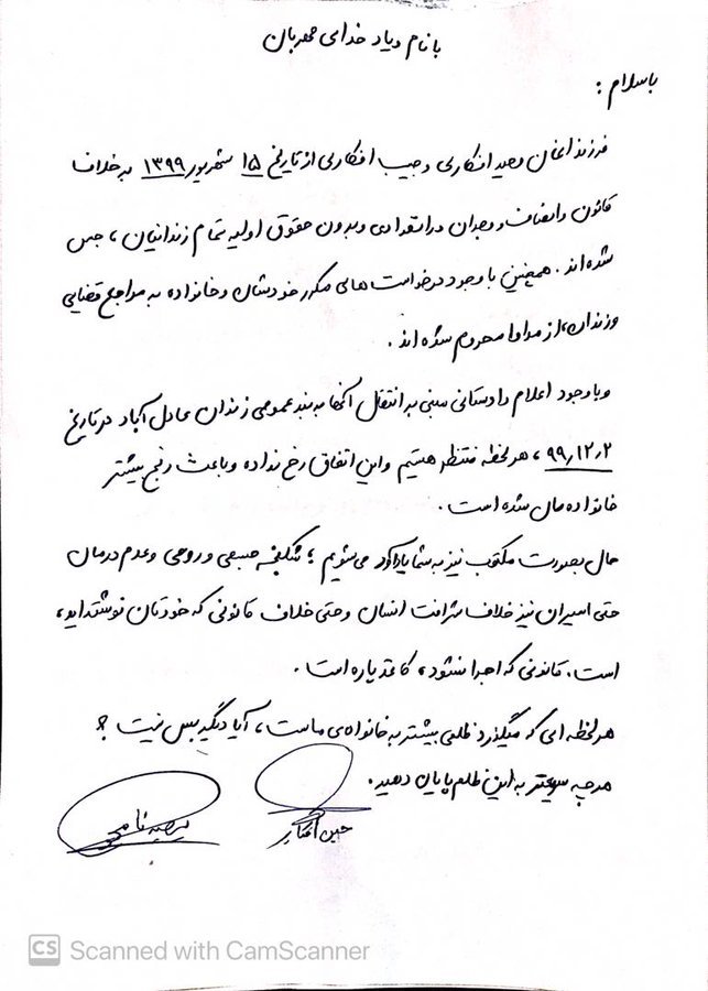«… با وجود اعلام دادستانی مبنی به انتقال آنها به بند عمومی زندان عادل آباد در تاریخ ۹۹/۱۲/۲، هر لحظه منتظر هستیم و این اتفاق رخ نداده و باعث رنج بیشتر خانواده مان شده است … هر لحظه ای که میگذرد ظلمی بیشتر به خانواده ماست، آیا دیگر بس نیست؟ هر چه سریعتر به این ظلم پایان دهید.»