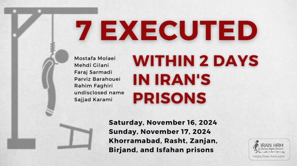 گزارشها حاکی از آن است که حداقل هفت زندانی طی روزهای شنبه ۲۶ آبان ۱۴۰۳ و یکشنبه ۲۷ آبان ۱۴۰۳ در زندانهای مختلف ایران اعدام شدهاند. این اعدامها در زندانهای خرمآباد، رشت، زنجان، بیرجند و اصفهان انجام شده است. اتهامات این افراد شامل جرایم مرتبط با مواد مخدر و قتل بوده است.