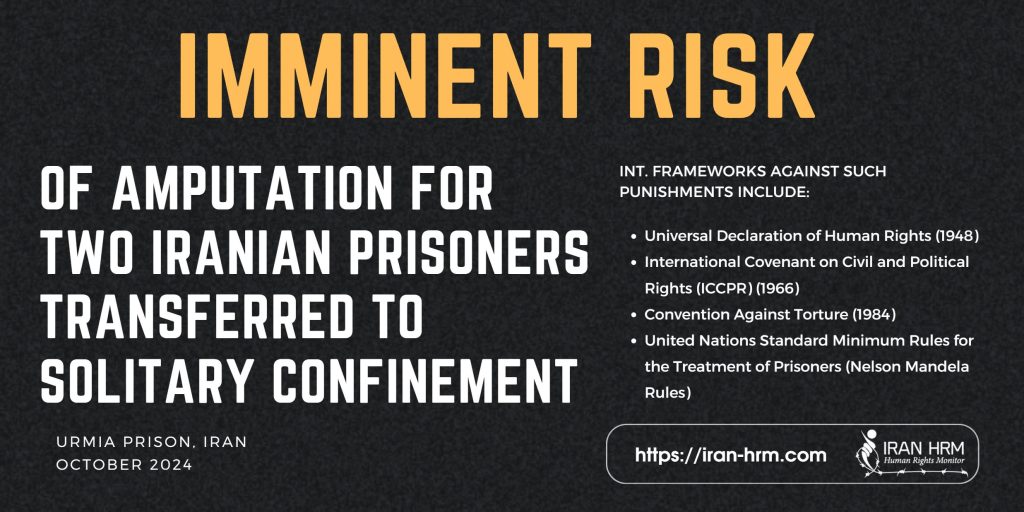 گزارشها حاکی از آن است که دو زندانی در ایران، شهراد تیموری و مهرداد تیموری، که هر دو پیشتر به اتهام دزدی به قطع انگشت محکوم شده بودند، پس از انتقال اخیر به انفرادی با خطر افزایش مجازات مواجهاند. این دو برادر در ماه اوت ۲۰۱۹ توسط شعبه یک دادگاه کیفری در ارومیه به این مجازات محکوم شدند و پیش از انتقال، ارزیابیهای پزشکی معمولی انجام شد که پیشنیاز اجرای چنین حکمی است.