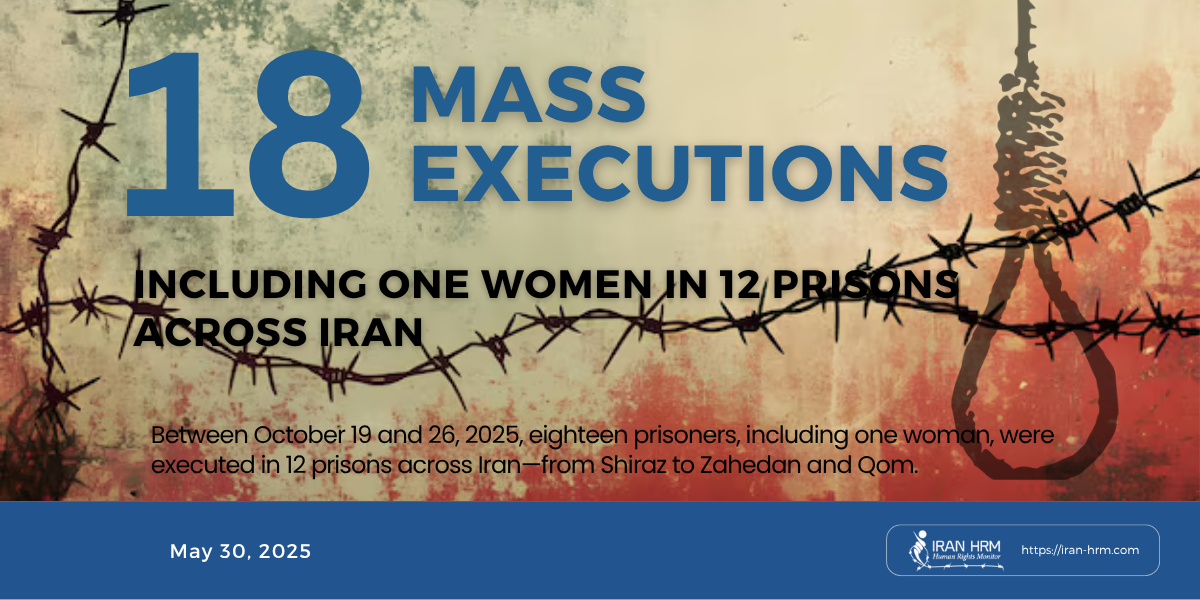 از سهشنبه ۲۹ مهر تا یکشنبه ۴ آبان ۱۴۰۴، ۱۸ زندانی از جمله یک زن در ۱۲ زندان کشور از شیراز تا زاهدان و قم اعدام شدند. این اعدامها در حالی صورت گرفت که گزارشها از افزایش چشمگیر شمار اعدامها در سراسر کشور حکایت دارد. منابع میگویند رژیم با استفاده از مجازات مرگ، در پی ایجاد رعب اجتماعی و مهار اعتراضات مردمی است.