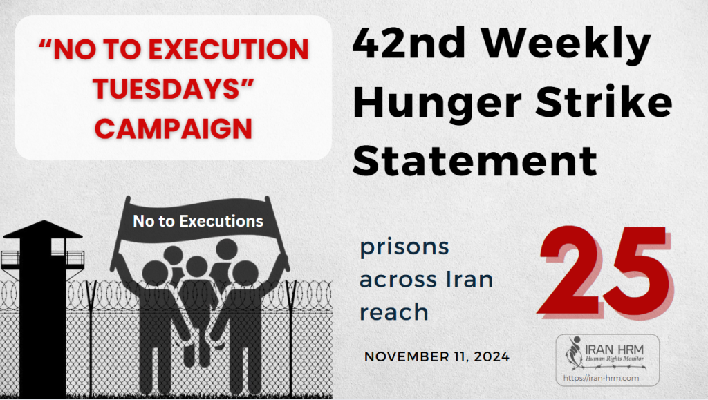 اعضای کارزار«سهشنبه های نه به اعدام» روز سهشنبه، ۲۲ آبان ۱۴۰۳، در هفته چهل و دوم در ۲۵ زندان مختلف در اعتصاب غذا هستند.
