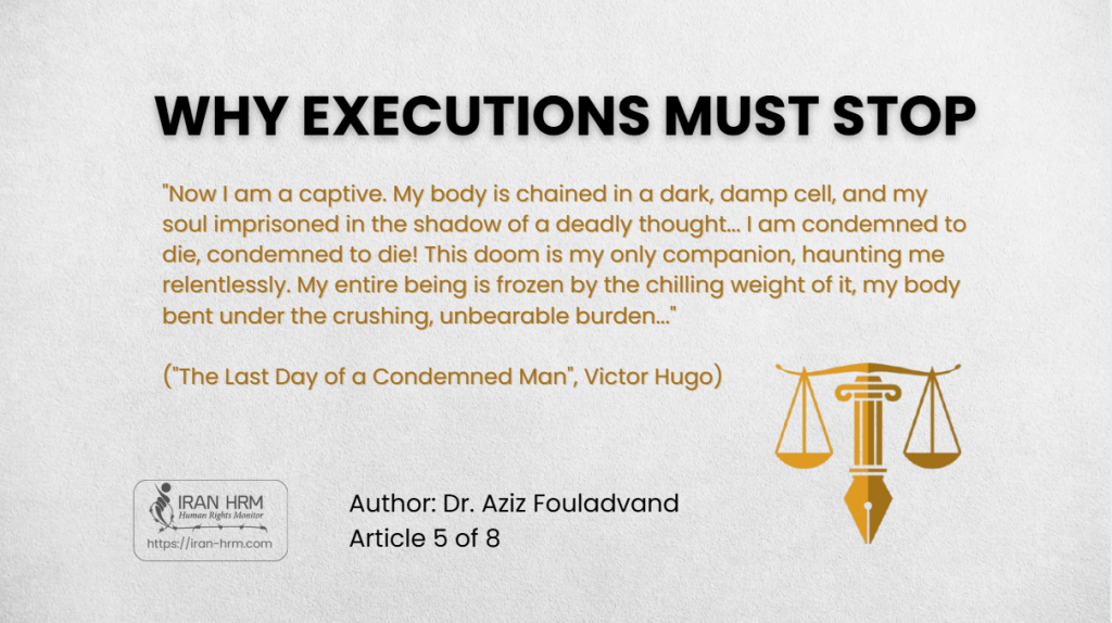 «اکنون من اسیرم. جسمم را در دخمهای تیره و تار به زنجیر کشیده و روحم را در ظلمت اندیشهای مرگبار به زندان انداختهاند… من محکوم به اعدامم، محکوم به اعدام!… انیس و ندیمی جز آن ندارم. سراپایم از احساس آن یخ کرده و تنم در زیر فشار سنگین توانفرسای آن خمیده است!…» («آخرین روز یک محکوم»، ویکتور هوگو)