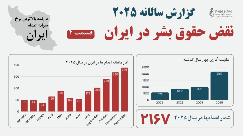 این بخش، چهارمین قسمت از گزارش سالانه نقض حقوق بشر در ایران در سال 2025 است. در بخشهای پیشین، ابتدا نقض حق حیات و افزایش کمسابقه اجرای احکام اعدام، و سپس تشدید سیستماتیک نقض حقوق زندانیان بررسی شد. آنچه در این بخش میآید، ادامه همان منطق سرکوب است که در زندانها و در اجرای احکام مرگ اعمال میشود؛ با این تفاوت که در اینجا، نقض حقوق زنان در تمامی سطوح، از زندان و نظام قضایی تا زندگی روزمره در جامعه، مورد بررسی قرار میگیرد.