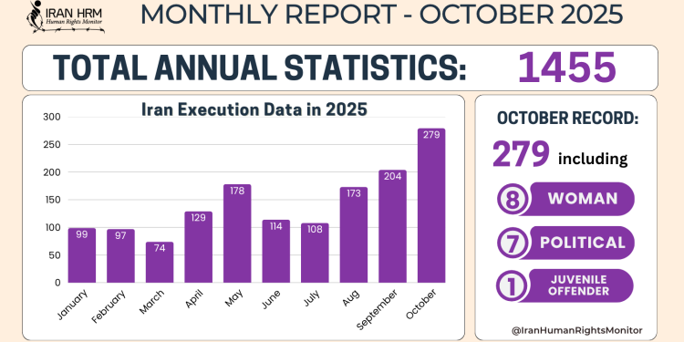 وضعیت حقوق بشر در ایران در اکتبر ۲۰۲۵ بیش از پیش وخیم شد؛ این ماه با ثبت بیسابقه حداقل ۲۷۹اعدام، از جمله هشت زن و یک نوجوان زیر ۱۸ سال، موج اعدامهای دستهجمعی در دهها زندان، و تداوم نقض روند دادرسی و بیتوجهی پزشکی نسبت به زندانیان سیاسی همراه بود.
