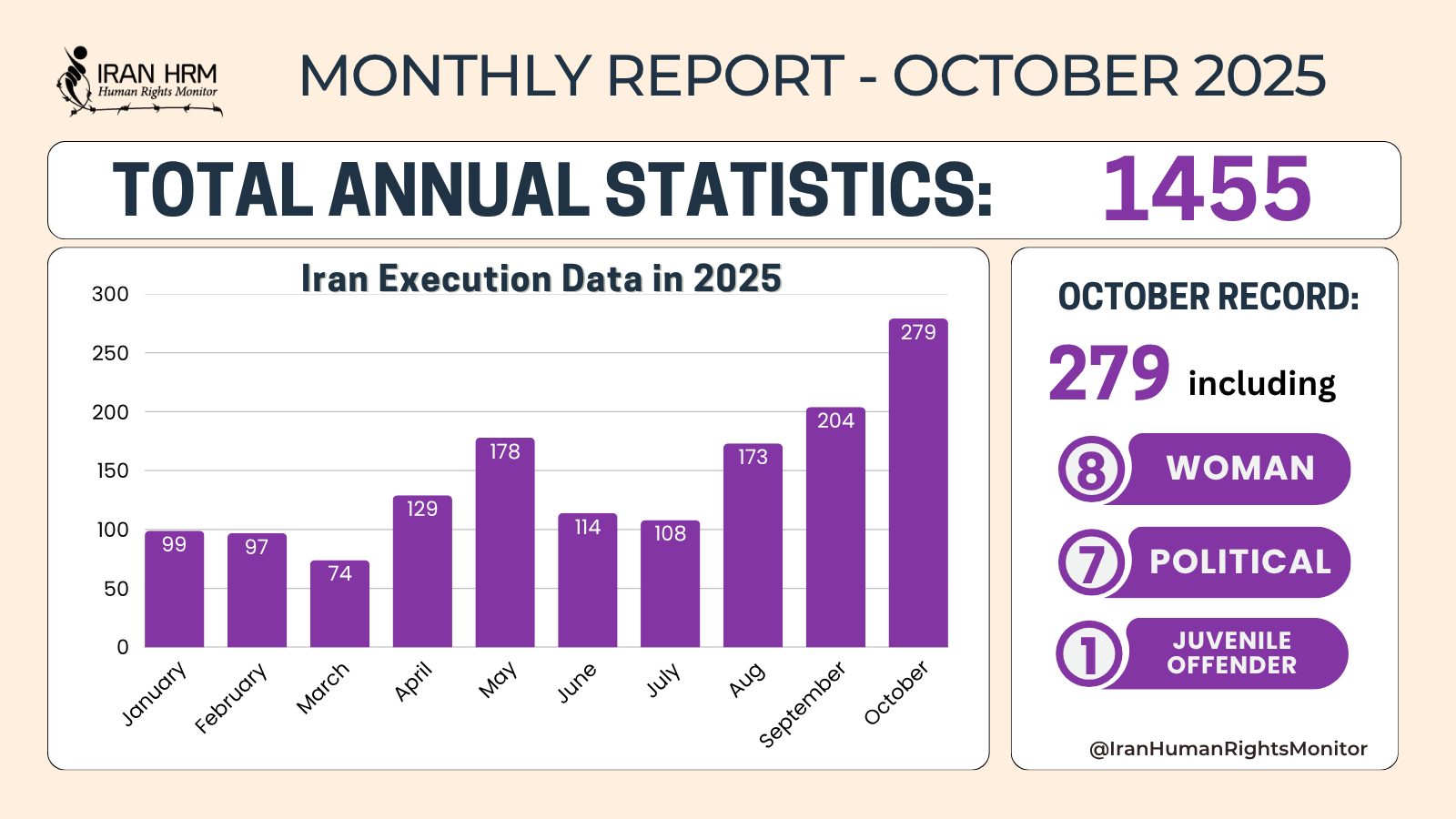 اکتبر ۲۰۲۵ شاهد اوجگیری بیسابقهای در شمار اعدامها در سراسر ایران بود؛ همزمان فشارها بر زندانیان سیاسی افزایش یافت، بیتوجهی سیستماتیک پزشکی ادامه داشت و اعتراضات گسترده زندانیان علیه حکم اعدام در زندانهای مختلف کشور شکل گرفت. شمار مستند اعدامها در این ماه به حداقل 279مورد رسید — بالاترین آمار ماهانه در دهههای اخیر — که مجموع ثبتشده را به ۱۴۵۵ مورد در ده ماه نخست سال ۲۰۲۵ رساند. این ماه شامل اعدام زنان، نوجوانان مجرم، اعدامهای علنی، و اعدام هفت زندانی سیاسی در تاریخ ۴ اکتبر در اهواز و کرج بود. خانوادههای محکومان به اعدام بهطور مکرر در تهران دست به اعتراض زدند و حدود ۱۵۰۰ زندانی محکوم به اعدام در زندان قزلحصار، با اعتصاب غذای چندروزه خواستار توقف اعدامها شدند.