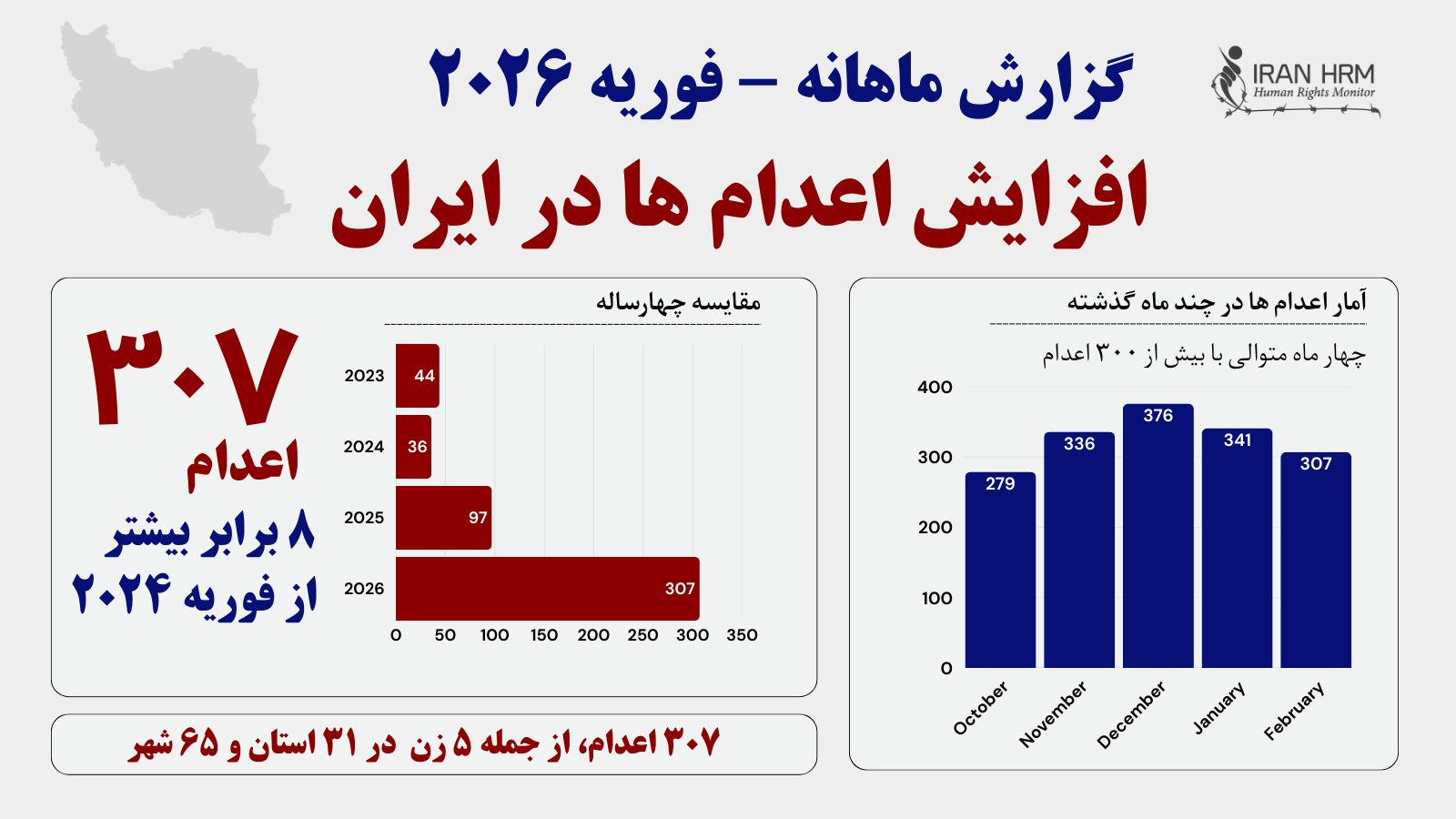 ماشین اعدام رژیم ایران، عملیات خود را در ماه فوریه تشدید کرد و جان دستکم ۳۰۷ نفر را در ۳۱ استان و ۶۵ شهر گرفت. این رقم وحشتناک شامل اعدام ۵زن است که به چوبههای دار سپرده شدند. مقیاس اعدامها در این دوره نسبت به سالهای گذشته افزایش چشمگیری داشته و بیش از ۴ برابر مجموع اعدامهای ثبتشده در بهمن ۱۴۰۳ (۷۶ اعدام)، ۸.۵ برابر بهمن ۱۴۰۲ (۳۶ اعدام) و حدود ۷ برابر بهمن ۱۴۰۱ (۴۴ اعدام) بوده است. این روند نگرانکننده، تلاش مذبوحانه رژیم برای حفظ قدرت از طریق خشونت و ارعاب محض را نشان میدهد.
