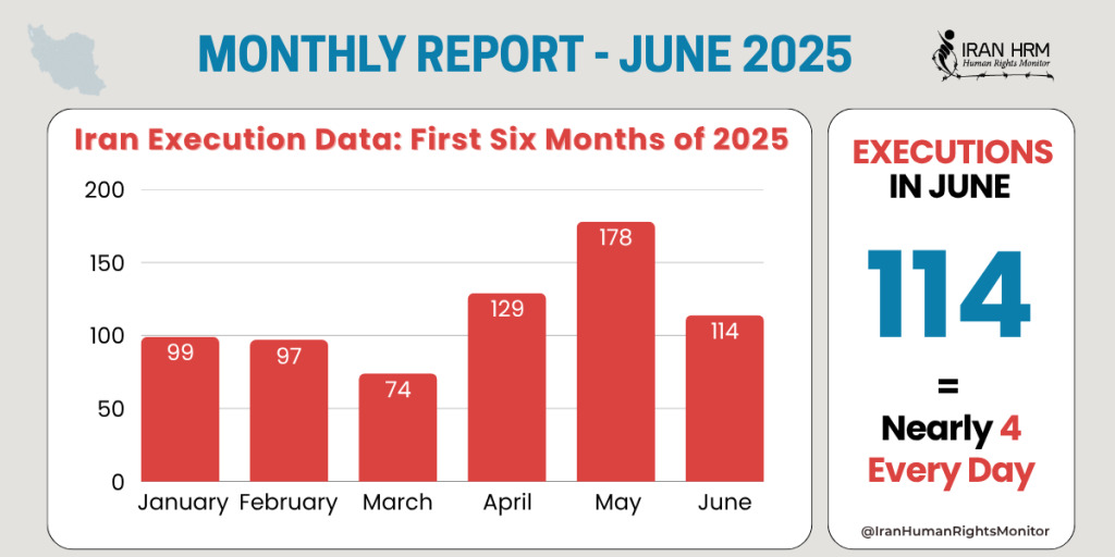 ماه ژوئن ۲۰۲۵ شاهد افزایش چشمگیر در شمار اعدامها، بازداشتهای گسترده، شرایط غیرانسانی در زندانها، و اقدامات سرکوبگرانه علیه زندانیان سیاسی و اقلیتها در ایران بود. در مجموع، ۱۱۴ مورد اعدام در سراسر کشور انجام شد که ۹۵ مورد از آنها بدون اعلام رسمی مقامات اجرا گردید. شش نفر به اتهام جاسوسی اعدام شدند و موارد متعددی از خشونت، شکنجه و ناپدیدسازی اجباری زندانیان سیاسی گزارش شده است. جمهوری اسلامی همچنان به استفاده سیستماتیک از مجازات اعدام و بازداشتهای خودسرانه برای سرکوب اعتراضات و ایجاد فضای رعب و وحشت در جامعه ادامه میدهد.