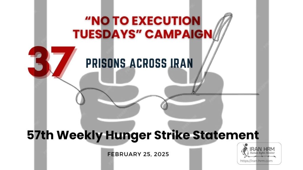 اعضای کارزار «سهشنبههای نه به اعدام» در هفته پنجاهوهفتم، روز سهشنبه ۷ اسفند ۱۴۰۳، در ۳۷ زندان زیر دست به اعتصاب غذا خواهند زد:
